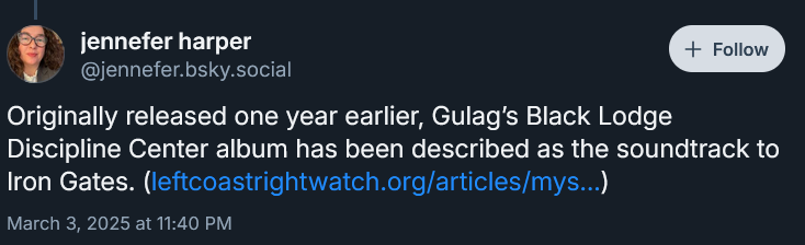 Barker’s recent music projects also include Gulag and Division Omega. The audio project Gulag was based on recordings from the Temple of Blood’s unconsensual sex and torture chamber called The Black Lodge Disicipline Center operated by Daniel Barker. Martinet Press released that project as a soundtrack for the book Iron Gates, the contemporary equivalent of the Turner Diaries as the source of inspiration for accelerationist and decentralized mass-murder taken up by neo-Nazis and fascists (https://leftcoastrightwatch.org/articles/mysterious-death-spotlights-satanic-nazi-terror-network/).