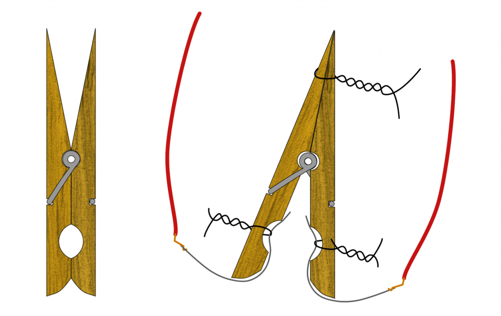 The clothespin must have a strong spring and the widest possible opening angle. Tie its handle ends together with a piece of wire. Then attach two metal strips like the ones described above to the other end with wire. It is important that the metal strips touch each other when the clothespin closes and that they are not in contact with the spring. Otherwise, the circuit will be closed even when the clothespin is in the open position.