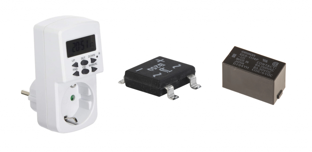 The choice of batteries depends on several factors. Firstly, the voltage required by the relay for switching must be determined. In the case of the adapter shown, it was about 12 volts. We connected two 9-volt batteries in series to get 18 volts. 9 The other question is how long the delay will be, which again depends slightly on the ambient temperature 10. With this design we ended up with a delay of about 72 hours, which is a lot, but theoretically an adapter with weekday switching can achieve a delay of 7 days.