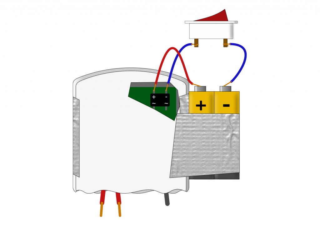 Then solder wires to both strips. Put a piece of cardboard between the moving part of the egg timer and its case to muffle the ticking noise. It’s best if not everyone notices it right away…