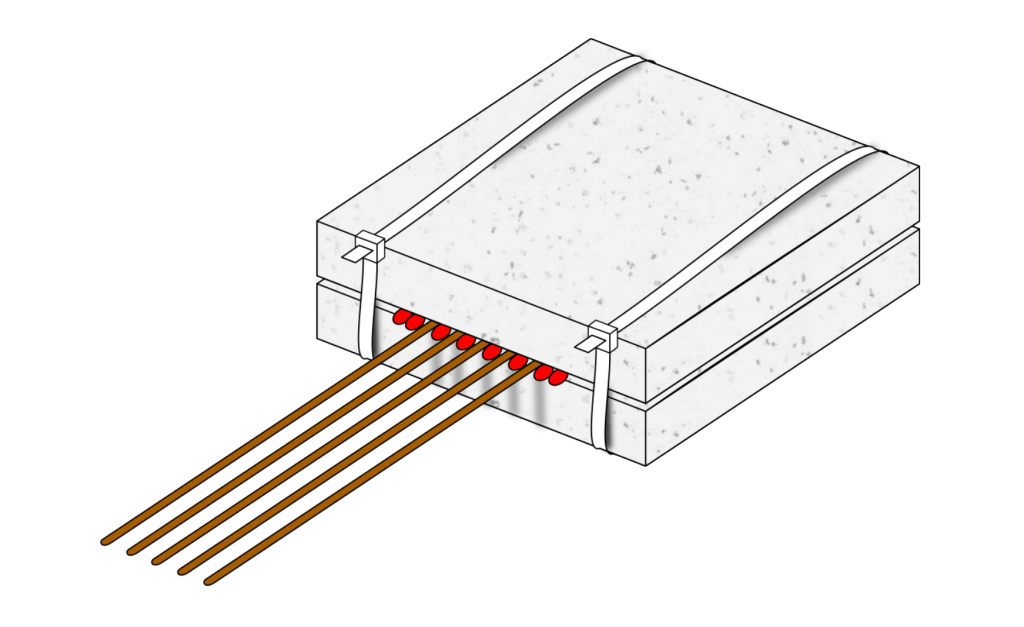 Take two solid rectangular firelighter blocks and glue them together with some liquid glue 5. Then secure them together with cable ties. Before the glue has dried, alternate matches and incense sticks between the blocks. The matches and incense sticks must be touching! To increase the reliability of the igniter, you can use as many incense sticks as you like. If you are concerned about smoke production, use fewer. The matches should protrude far enough from the block to get oxygen, but should be close enough to the firelighter to ignite it reliably.